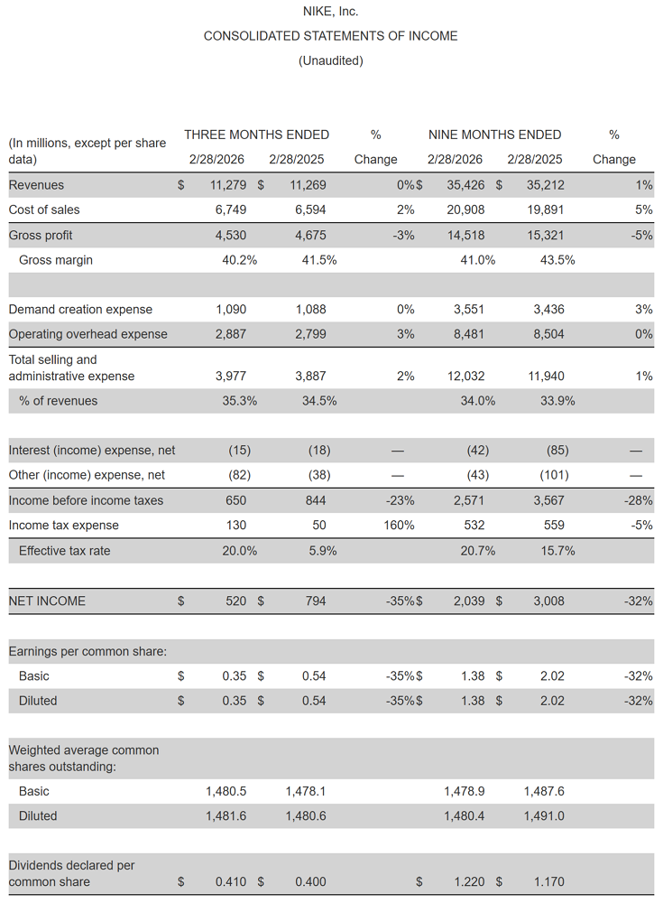綜合外媒報導,Nike 31日美股盤後公佈,2026會計年度第三季(截至2026年2月28日),營收與去年持平為112.8億美元,每股盈餘年減35%至35美分,優於LSEG統計的分析師預估值;當季批發收入年增5%至65億美元,但直營收入年減4%至45億美元。