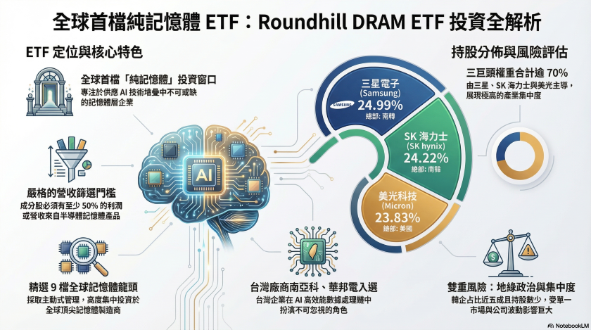 儘管AI帶動了記憶體市場的長期看好,但 Roundhill 在基金公開說明書中也詳細揭露了投資記憶體產業所面臨的多重風險。首先是「記憶體公司風險」,這些企業的產品線與市場可能較為單一,且高度依賴知識產權。此外,本基金具有高度的「集中風險」與「非分散化風險」,因為它僅持有 9 檔股票,且完全集中於資訊科技板塊中的單一細分產業。只要其中一家公司的市值出現下跌,對整體基金淨值的影響將遠大於持股廣泛的基金。