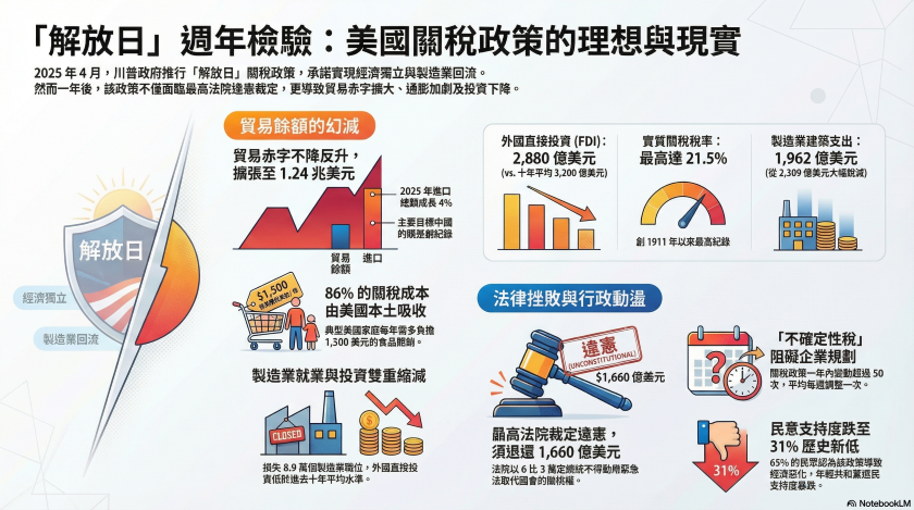 一年過後,實質關稅稅率雖高達上任時的四倍,但政府卻面臨 1,660 億美元的退款,17 項貿易協定無一獲國會批准。川普承諾的 「解放」,最終演變成一項推升物價、減少投資、擴大貿易赤字,並被裁定為違憲的失敗政策。它所引發的全球農業貿易結構性變遷,其深遠影響恐將遠勝於關稅政策本身。