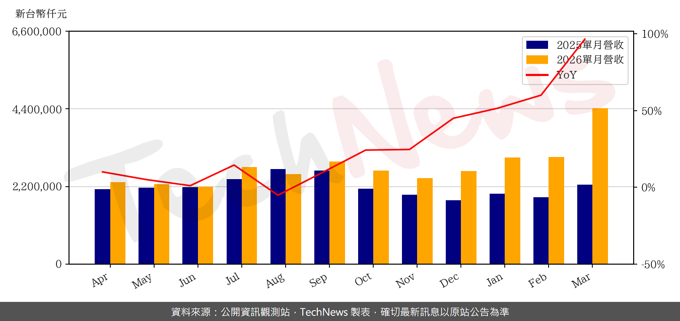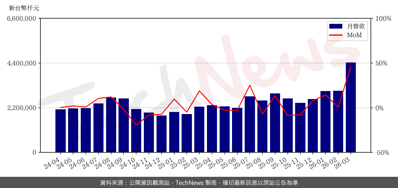 記憶體大廠旺宏公布 2026 年 3 月份內部自行結算之合併營收。受惠於市場需求及報價上揚,旺宏 3 月合併營收達新台幣 44.22 億元,較上月大幅增加 45.9%,與 2025 年同期相比更飆升 96.5%。累計第一季合併營收達 104.69 億元,較 2025 年同期大幅成長 70.6%。