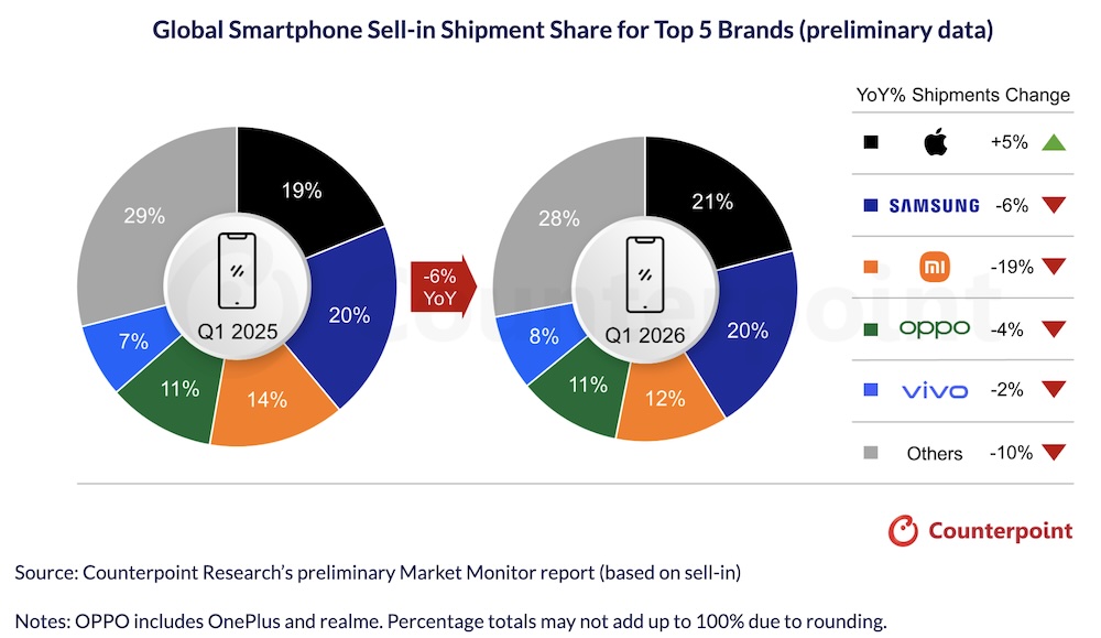 Counterpoint 在報告中指出,2026 年第一季全球智慧手機出貨下滑 6%,並以「記憶體吃緊」作為核心原因,且強調蘋果在該季首度成為第一季全球出貨冠軍。