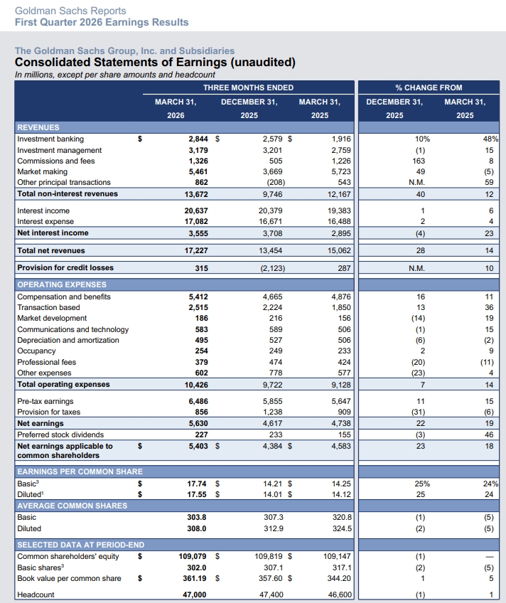 根據高盛4月13日公布財報,2026年第一季(截至2026年3月31日)營收年增14%至172.3億美元,高於市場預期的169.7億美元;淨利較去年同期成長19%至56.3億美元,即每股盈餘17.55美元,亦擊敗市場預期的16.49美元。