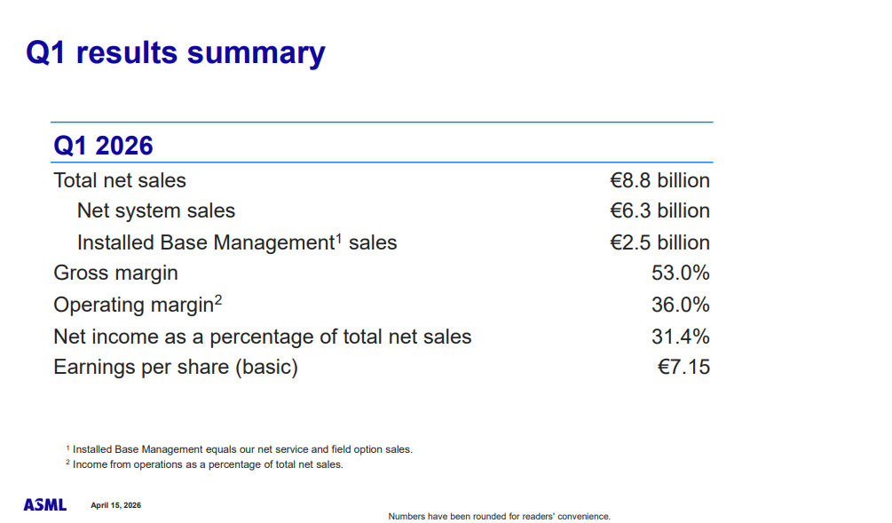 根據最新公布的數據,ASML 2026年第一季的銷售淨額 (net sales) 達到了 88 億歐元(約合 104 億美元),不僅順利達成公司先前預估的 82 億至 89 億歐元目標區間,更超越了市場共識的 85 億歐元預期數字。