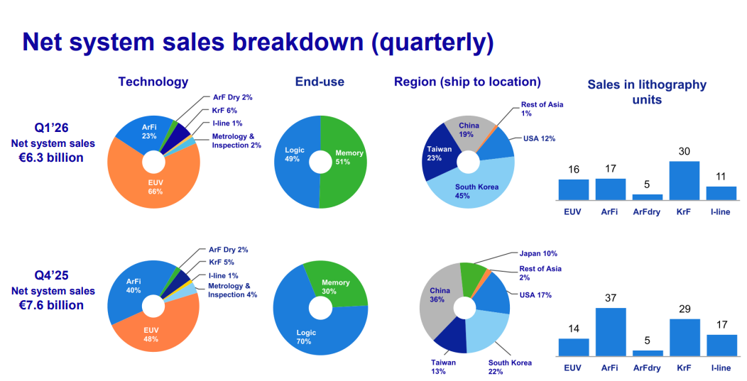 在獲利方面,第一季淨收入(net income/net profit)高達 28 億歐元,同樣大幅度超越市場原先預期的 25 億歐元。此外,第一季的毛利率(gross margin)達到了亮眼的 53%,順俐落在公司財測的高標水準。ASML 執行長 Christophe Fouquet 對此財報表現予以肯定,並表示,我們第一季的總銷售淨額達為 88 億歐元,與財測一致。毛利率為 53%,落在財測高標。