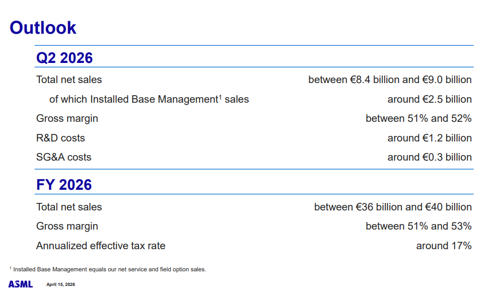 由於強勁的市場動能,ASML 對未來的展望更趨樂觀,宣布將 2026 年的全年銷售淨額預測上調至 360 億至 400 億歐元之間,相較於先前預測的 340 億至 390 億歐元有顯著提升。同時,ASML 預期 2026 年全年的毛利率將落在 51% 至 53% 的高水準區間。