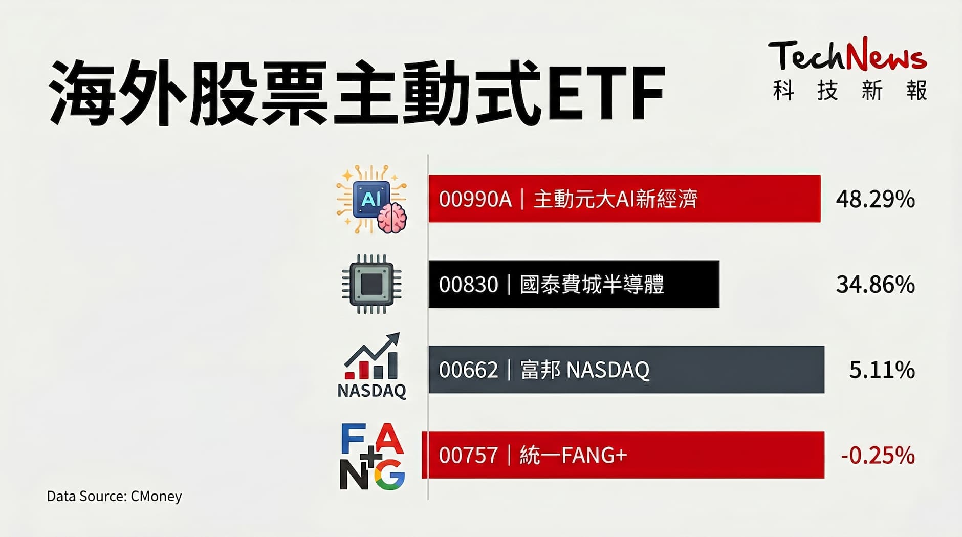 今年以來科技七巨頭表現相對疲弱,影響大型指數表現,統計今年以來至 4 月 21 日富邦NASDAQ(00662)、統一FANG+(00757)報酬率分別為 5.1% 及 -0.3%,但無礙主動式 ETF 超額報酬能力,包括 00990A 上漲 48.3%,大幅領先傳統指數。