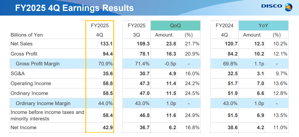 2025年度(2025年4月-2026年3月)DISCO合併營收年增11.1%至4,368.89億日圓、出貨額年增10.3%至4,428.24億日圓、合併營益增加10.9%至1,849.89億日圓、合併純益增加9.4%至1,355.21億日圓,營收、出貨額、營益、純益皆連續第6年創下歷史新高紀錄。