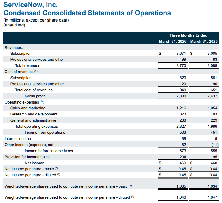 Q1期間,訂閱收入較去年同期成長22%至36.71億美元。ServiceNow指出,訂閱收入成長率面臨「約75個基點的逆風,主因中東衝突導致數個大型在地端部署(on-premise)交易延遲結案」。