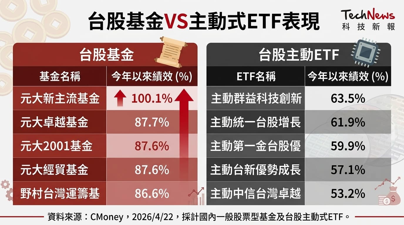 台股今年以來表現世界強,今年以來截至 4 月 22 日漲幅破三成,台股基金平均繳交出近六成的亮眼績效,最強一檔元大新主流基金更以超過 100% 的績效一枝獨秀,強壓熱度竄升主動統一台股增長(00981A),稱霸台股基金。
