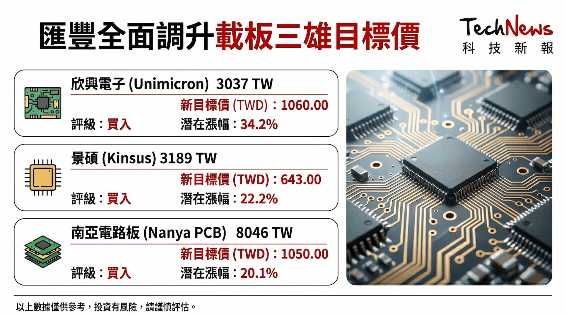 外資強調,AI 產品因設計複雜度高、生命週期較短,不僅對載板規格(如大尺寸、高層數)要求更嚴苛,生產良率也相對較低,進而消耗更多產能,因此維持對台灣載板三雄的「買入」評級,並全面調升欣興、景碩、南電目標價至 1,060 元、643 元、1,050 元。