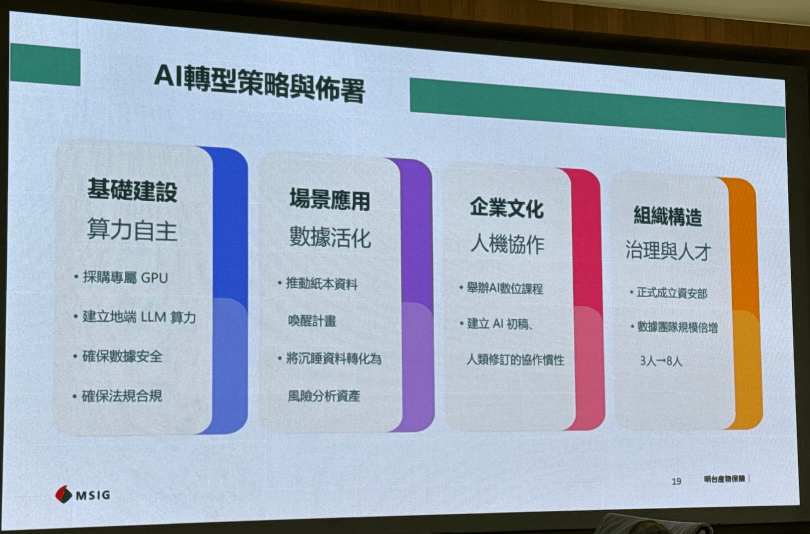 矢持健一郎分享,「人」仍是保險服務的核心,保險業務本質在於客戶的互動與情感信任,其角色無可取代,因此 AI 策略方向並非大規模人力精簡,而是致力於現有員工的「技能升級」,並採購專屬 GPU 建立地端 LLM(大型語言模型)算力,預計下半年將紙本轉化為支援風險分析的數據。
