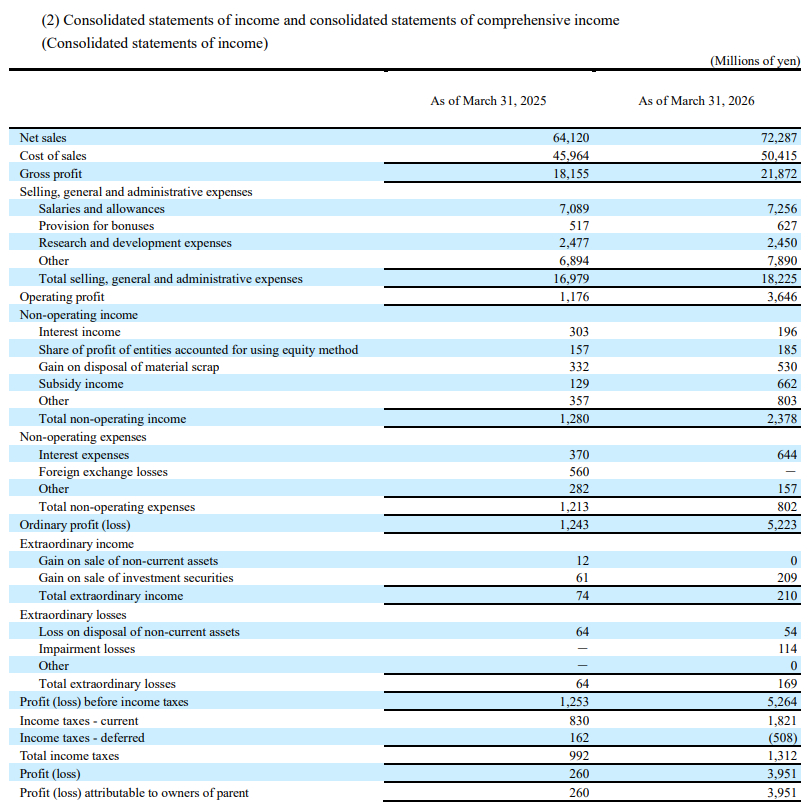 2025年度(2025年4月-2026年3月)KOA合併營收年增12.7%至722.9億日圓,合併營益飆增210%至36.5億日圓,合併純益狂飆14倍(狂飆1,419%)至39.5億日圓。