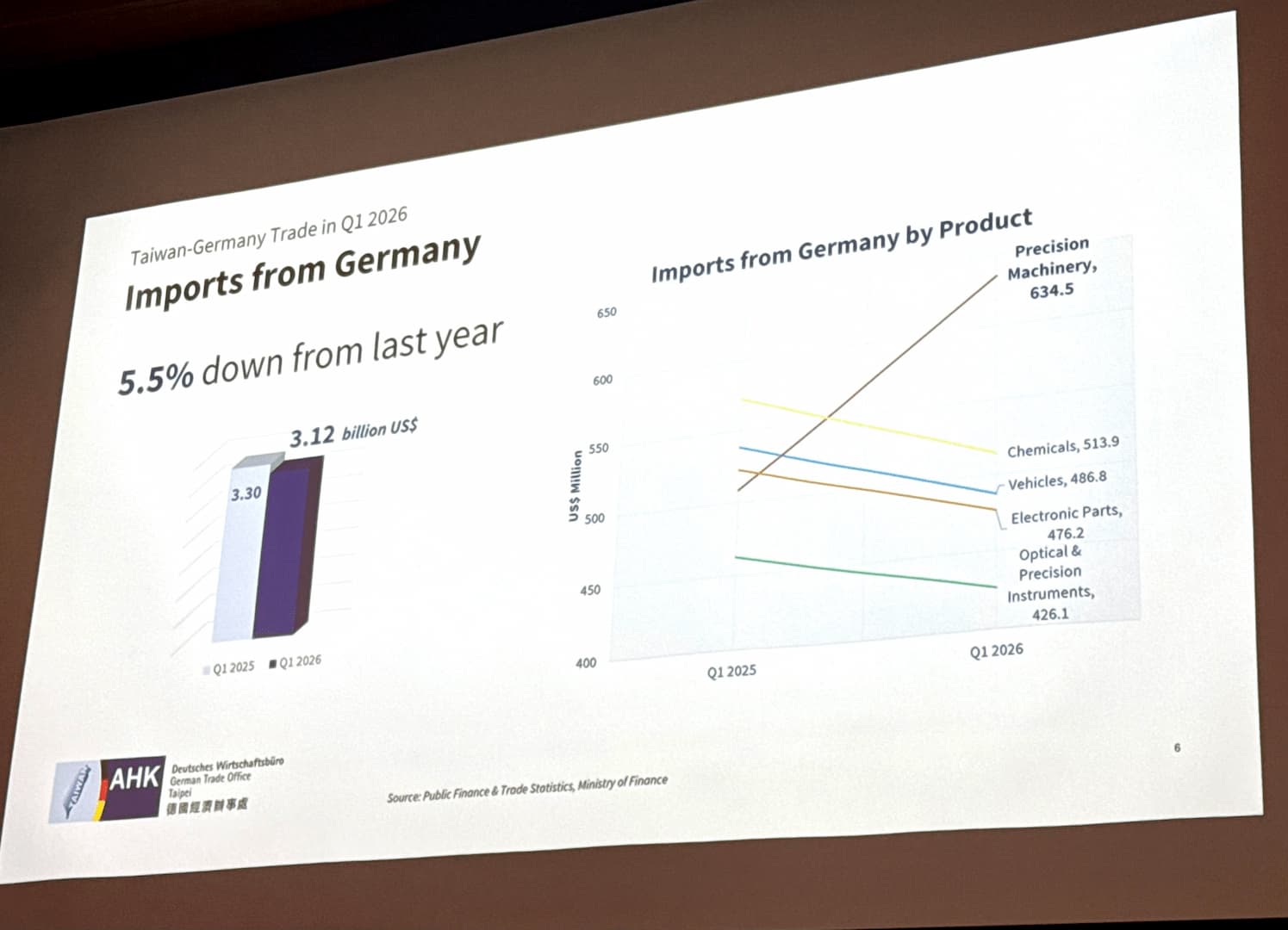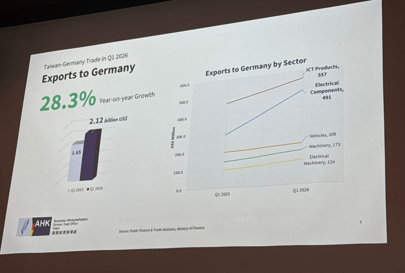 統計 2026 年第一季台灣對德國出口總額達 21.21 億美元,年增 28.3%,其中電子零組件出口額達 4.9 億美元,年增 71.2%,表現亮眼;資通與視聽產品維持成長動能,出口額達 5.57 億美元,年增20.4%,顯示全球 AI 浪潮,台灣作為德國高科技供應鏈關鍵夥伴的角色日益重要。