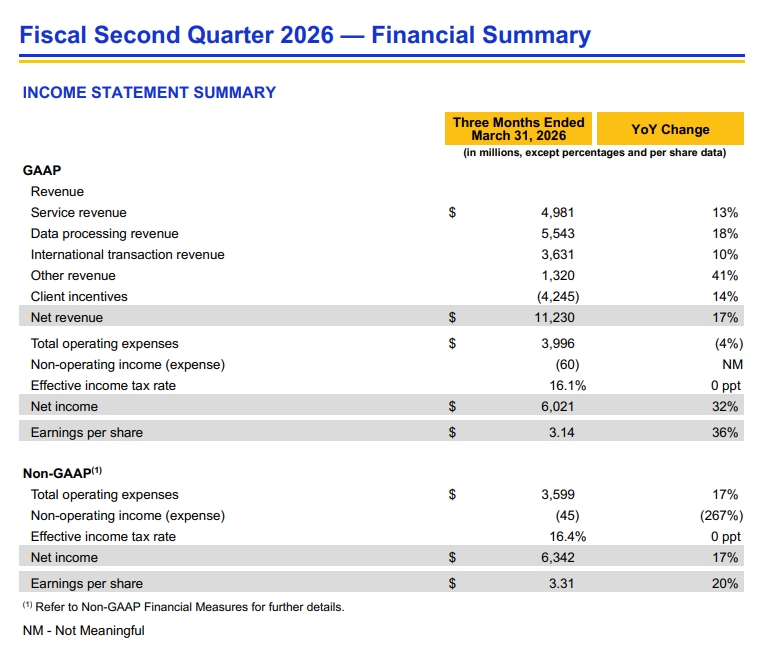 路透社等外媒報導,根據Visa 4月28日公布財報,2026會計年度第二季(截至2026年3月31日),營收年增17%至112億美元,超出FactSet共識預期的107.5億美元;扣除一次性收益,調整後每股盈餘為3.31美元,年增高達20%,同樣優於FactSet調查所預期的3.10美元。