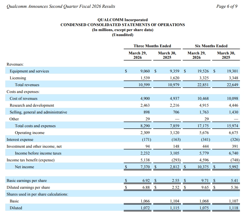 高通於29日美股盤後公布,2026會計年度第二季(截至2026年3月29日),經調整每股盈餘2.65美元,較市場預期高出0.09美元;營收106億美元,符合市場預期。不過,高通保守看待第三季展望,預估營收介於92億至100億美元,低於市場普遍預期的101.9億美元,引發盤後股價一度重挫逾7%。